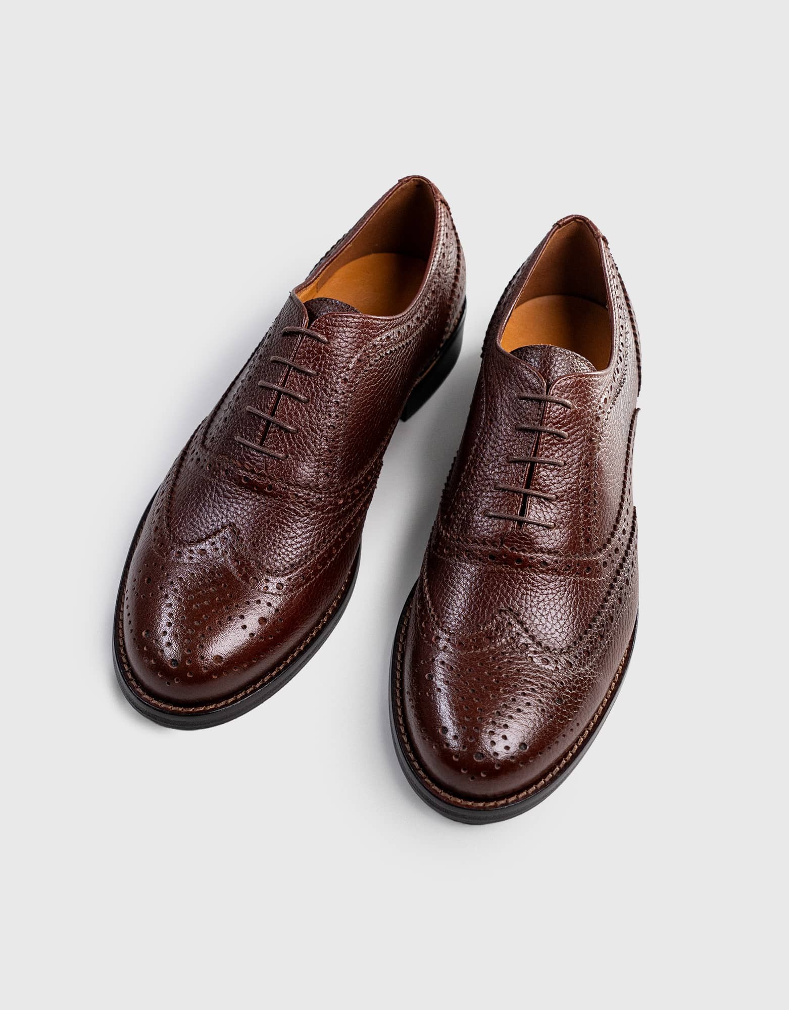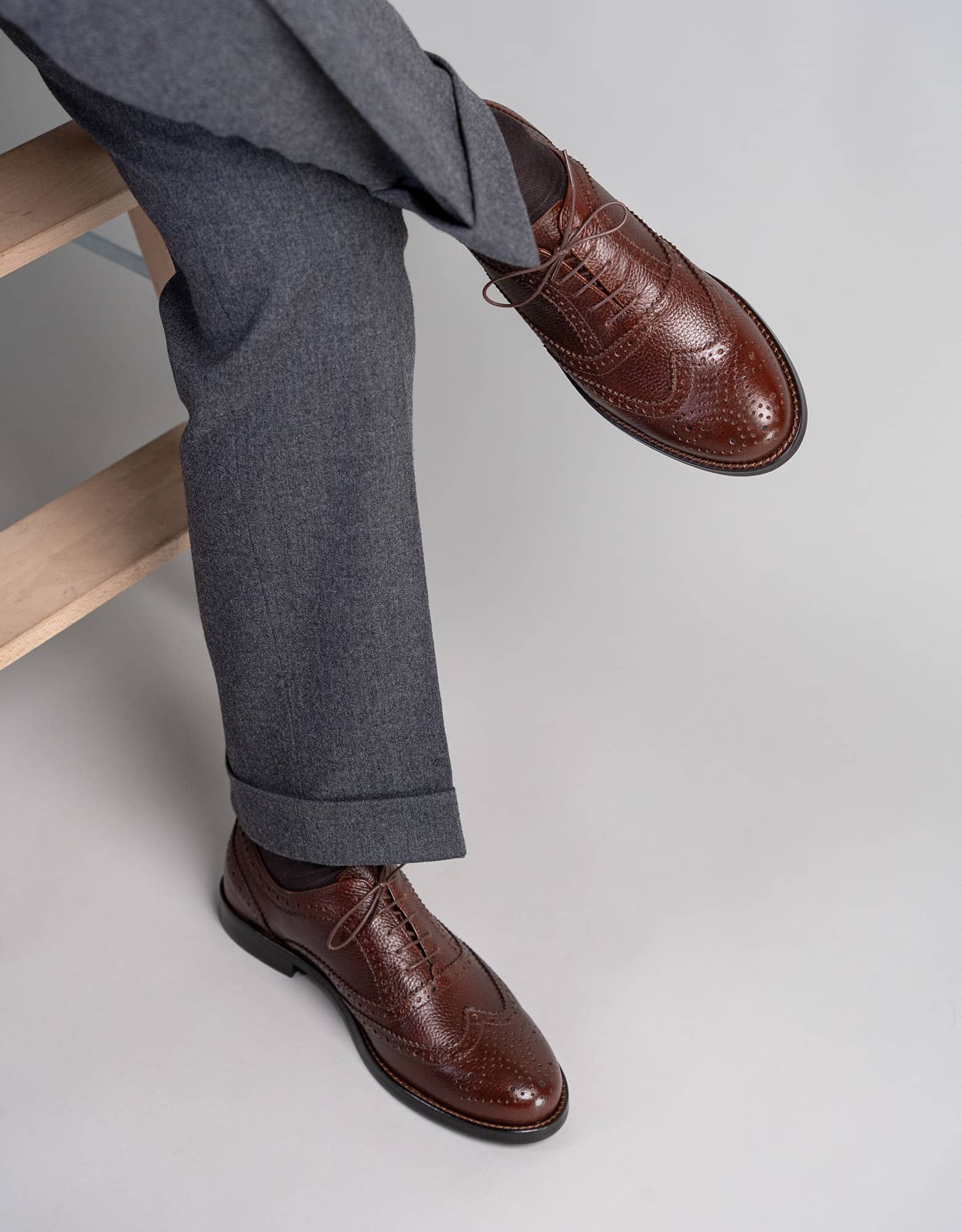 Buty zostały wykonane z naturalnej skóry bydlęcej o groszkowanej fakturze. W połączeniu z brogowaniami i brązowym kolorem daje to efekt elegancki, ale bardziej swobodny i dzienny niż w przypadku gładkiej skóry. Całość osadzona jest na skórzanej podeszwie, która dobrze współgra z charakterem tego modelu i podkreśla jego klasyczne wykończenie.